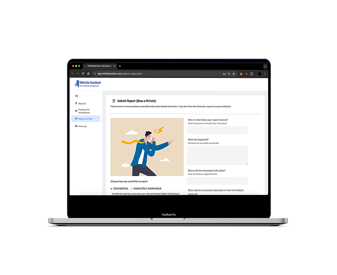 WhistleSentinel prioritize the protection of whistleblowers, allowing them Anonymous reporting of their concerns without fear of retaliation, ensuring complete confidentiality.